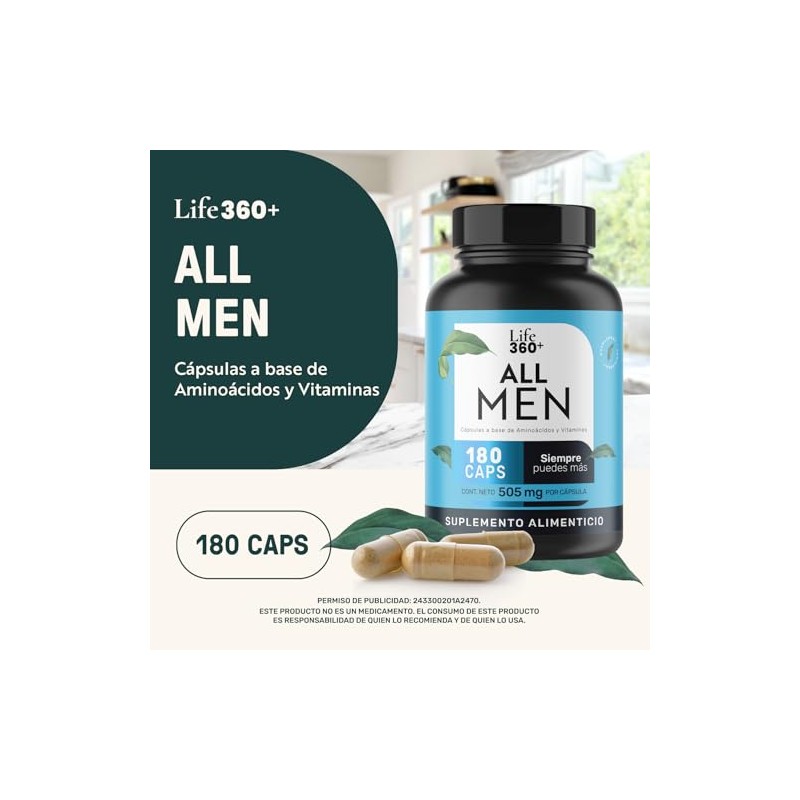 LIFE 360+ - LIFE 360+ Multivitamínico All Men | 180 Cápsulas | Creatina Monohidratada, BCAA 2:1:1 (L-Leucina, L-Isoleucina, L-Valina) y L-Arginina, Vitaminas A, E, C, D3, K B1 B2 B3 B5 B6 B12| Suplemento Alimenticio | Contenido 180 Cápsulas por Envase. 🏆 Reconocido por su excelente relación calidad-precio. Construcción robusta y atención al detalle. 💎 Calidad superior certificada. Ideal para quienes buscan lo mejor en calidad y estilo. Producto auténtico con satisfacción total asegurada. ¡No te quedes sin el tuyo y aprovecha esta oportunidad única!