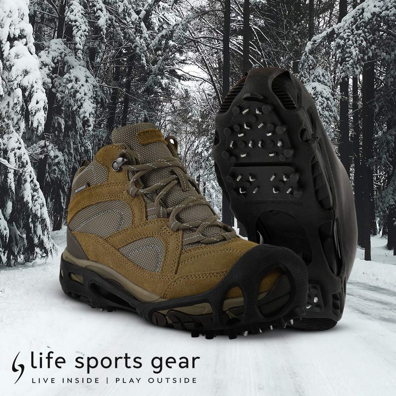 LIFE-SPORTS GEAR Grip Ice Cleats for Boots and Shoes, 28 Steel Cleats per Foot for a Great Traction on Ice and Snow with 10 Rubber stabilizers, Easy to Put On and Off