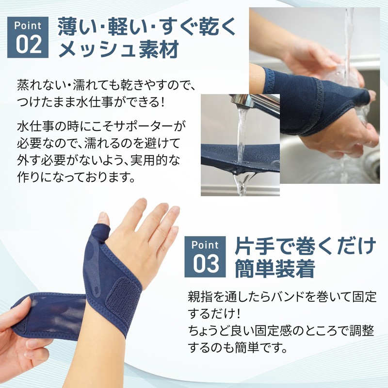 - 【水仕事でもそのままでOK】 メッシュ素材が使われた手首サポーターは、濡れてもすぐ乾きやすいのが魅力的!洗い物やお風呂掃除などの水仕事でも、外す必要がありません。軽くて蒸れにくいので、長時間の装着も快適です。「濡れたらどうしよう?」なんて気にせずに、思いっきり使える頼れるアイテムです。