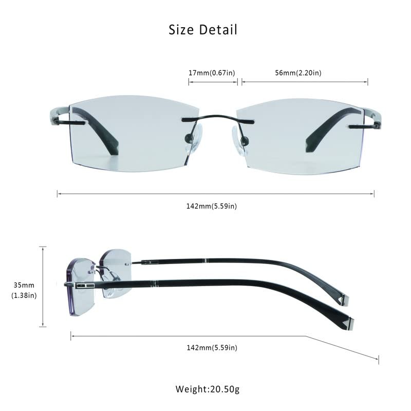 - Classic rimless frame design, ultra-lightweight, no pressure on your face and ears, durable with sturdy alloy frame.