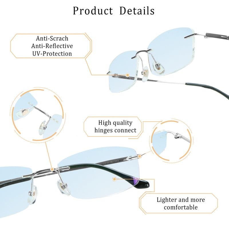 - Classic rimless frame design, ultra-lightweight, no pressure on your face and ears, Durable and sturdy pure titanium frame