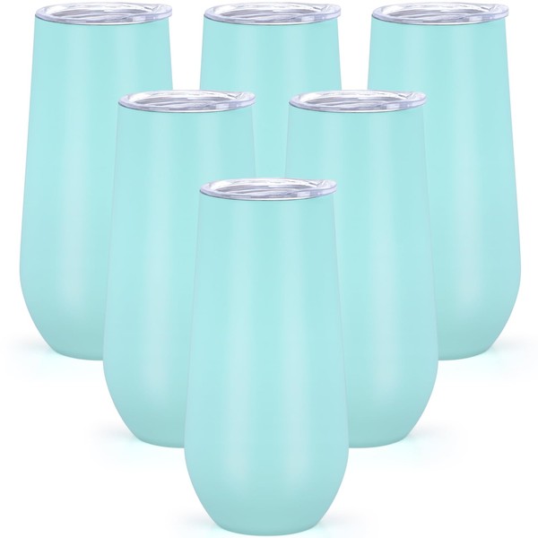 Lifecapido 6 Pack Stemless Champagne Flute Glass, 6 Oz Unbreakable Cocktail Champagne Tumbler, Stainless Steel Champagne Glass with Lid, Wedding Birthday Christmas Gifts for Friends(Seafoam)