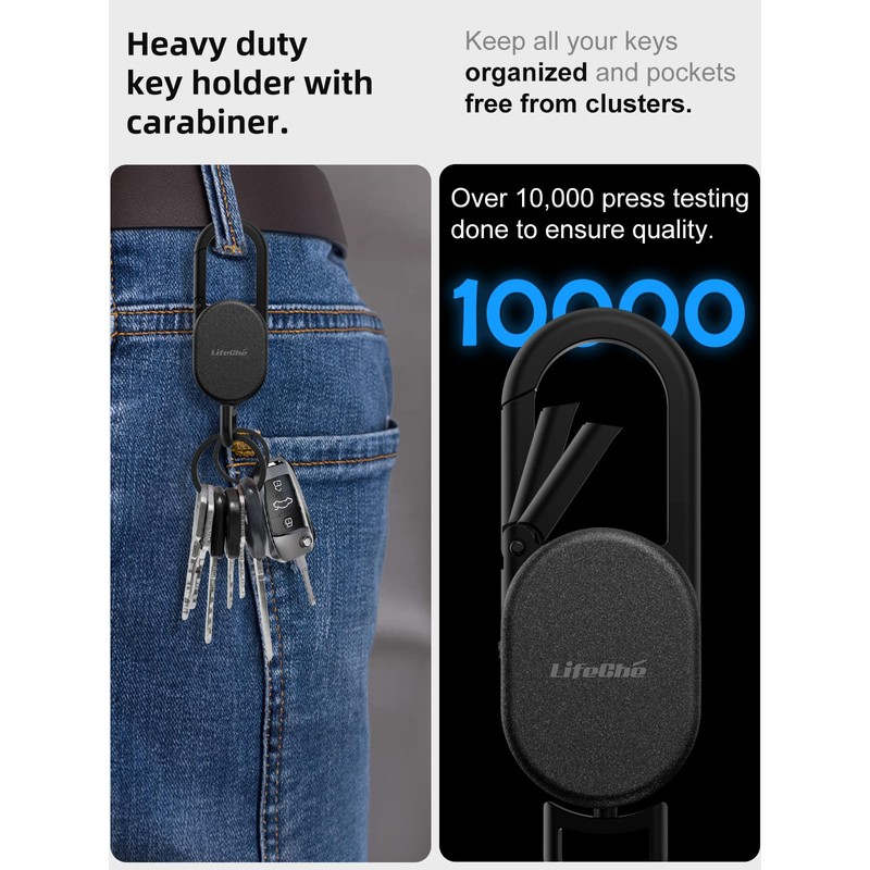 - User-Friendly – With 360° rotating hook and two key rings can hold all your keys. The large carabiner easily utilize on any loops on your jeans, belt loops, backpacks or bags, etc.