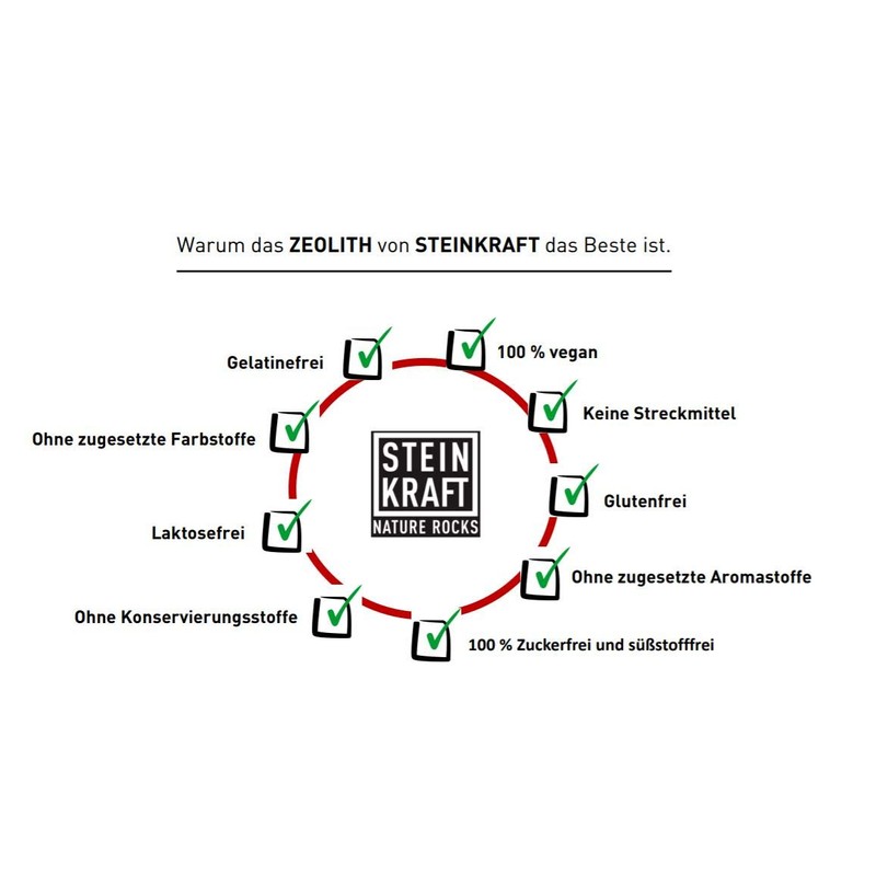 - Advance in raw material quality and purity - Zeolite has high ion exchange capacity and many trace elements. STEINKRAFT zeolite is not obtained by explosion, so higher purity and above all more basic energy of the raw material is guaranteed.