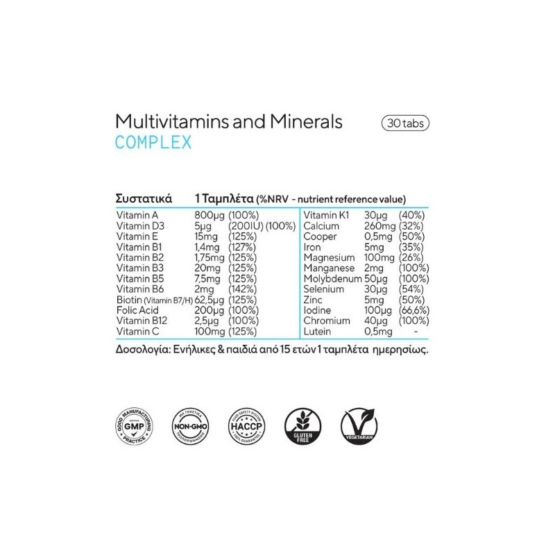 calcium carbonate, bulking agent: microcrystalline cellulose, magnesium oxide, L-Ascorbic acid, tocopheryl acetate, nicotinamide, iron (II) fumarate, marigold extract (lutein 5%), anti-caking agent: magnesium stearate, silicon dioxide, calcium d-pantothenate, zinc oxide, L-Selenomethionine, coating: hydroxypropylmethylcellulose, manganese (II) sulfate, retinyl acetate, copper (II) gluconate, pyridoxine hydrochloride, riboflavin, thiamine hydrochloride, cholecalciferol, phytomenadione, chromium (III) picolinate, folic acid, potassium iodide, sodium molybdate, D-Biotin, cyanocobalamin.