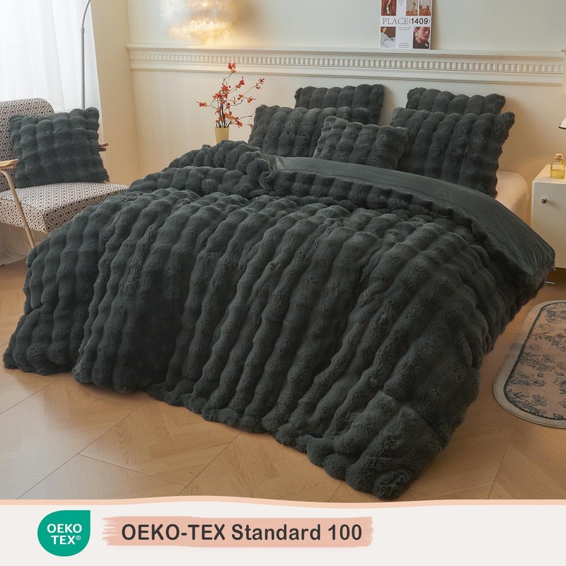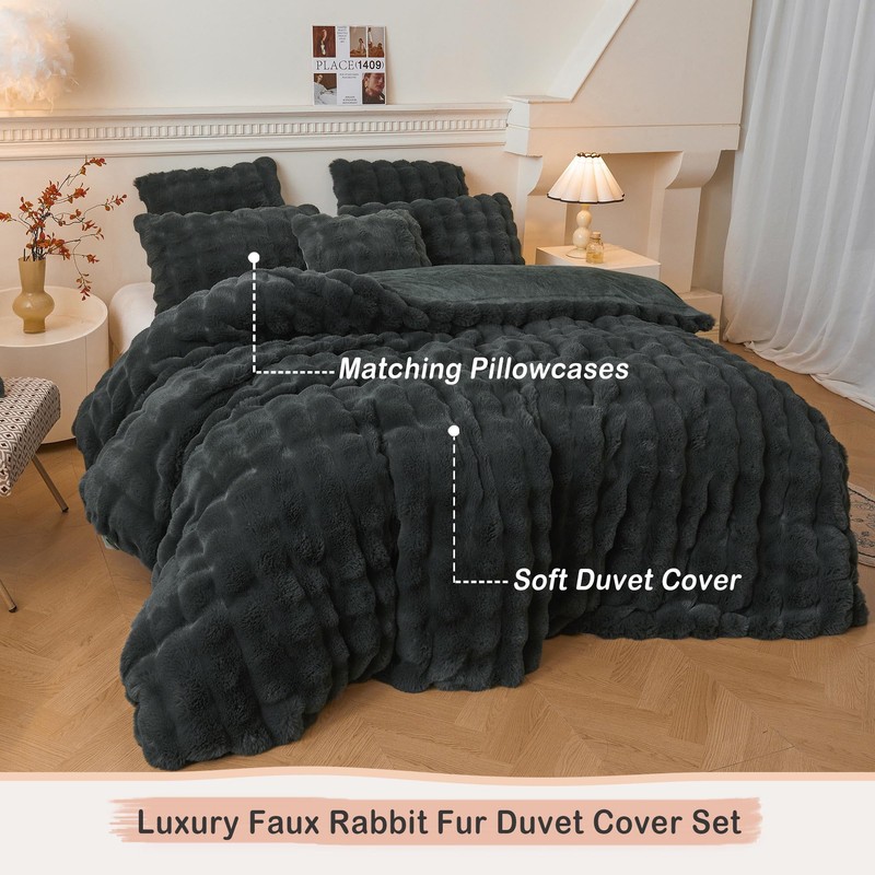 - Sturdy and Well-Designed: Our comforter cover showcases a unique puffed waffle-inspired texture, which not only adds an appealing tactile element but also complements the overall aesthetic. The hidden zipper gives it a sleek appearance and makes inserting the duvet a breeze. Inside, you'll find 8 corner ties that are useful for keeping your duvet in position. The faux rabbit fur is sturdy and non-shedding, and it's also pet-friendly, making it suitable for homes with furry friends.