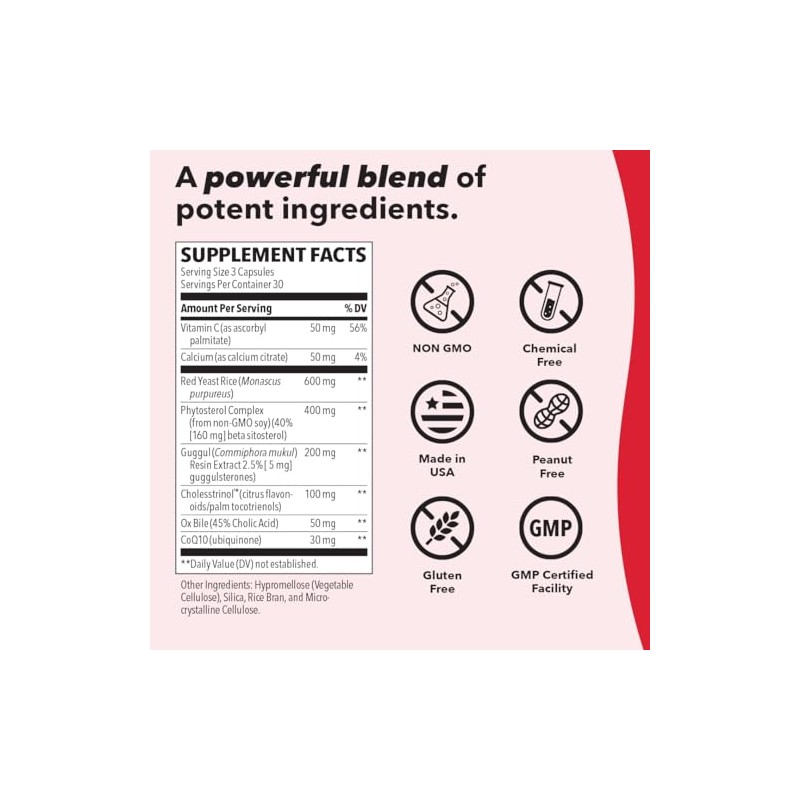 - Clinically Tested Ingredients - Crafted with all natural ingredients such as Red Yeast Rice, CoQ10, Guggul, and Beta Sitosterol to help the body support cholesterol levels.