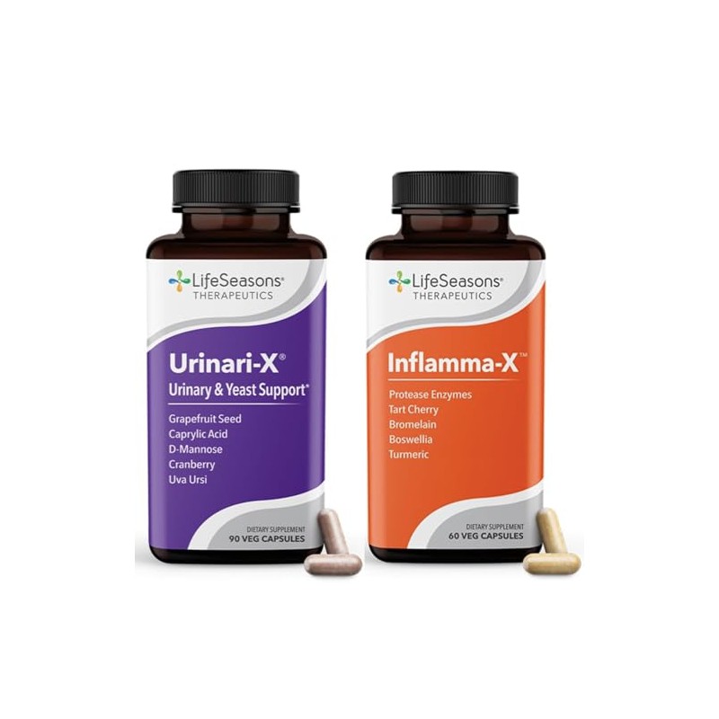 Support urinary tract health and relieve everyday aches with this targeted supplement bundle from LifeSeasons. Urinari-X blends clinically tested natural ingredients like Caprylic Acid, Cranberry, Grapefruit Seed Extract, and D-Mannose to promote urinary tract health, immune defense, and bladder comfort. Its combination of prebiotics and anti-adhesion compounds helps keep harmful bacteria from attaching to the urinary tract lining, supporting natural cleansing and long-term wellness. Inflamma-X delivers a powerful mix of Turmeric, Boswellia, Bromelain, Tart Cherry, and Protease Enzymes to soothe aches, reduce swelling, and support joint and muscle comfort. Together, these formulas provide comprehensive daily support for bladder health, urinary tract balance, and relief —helping you feel your best every day.