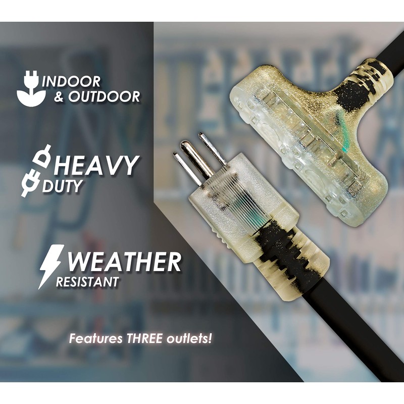 - 12AWG/3C 10 ft Black Indoor/Outdoor Triple Tap Extension Cord