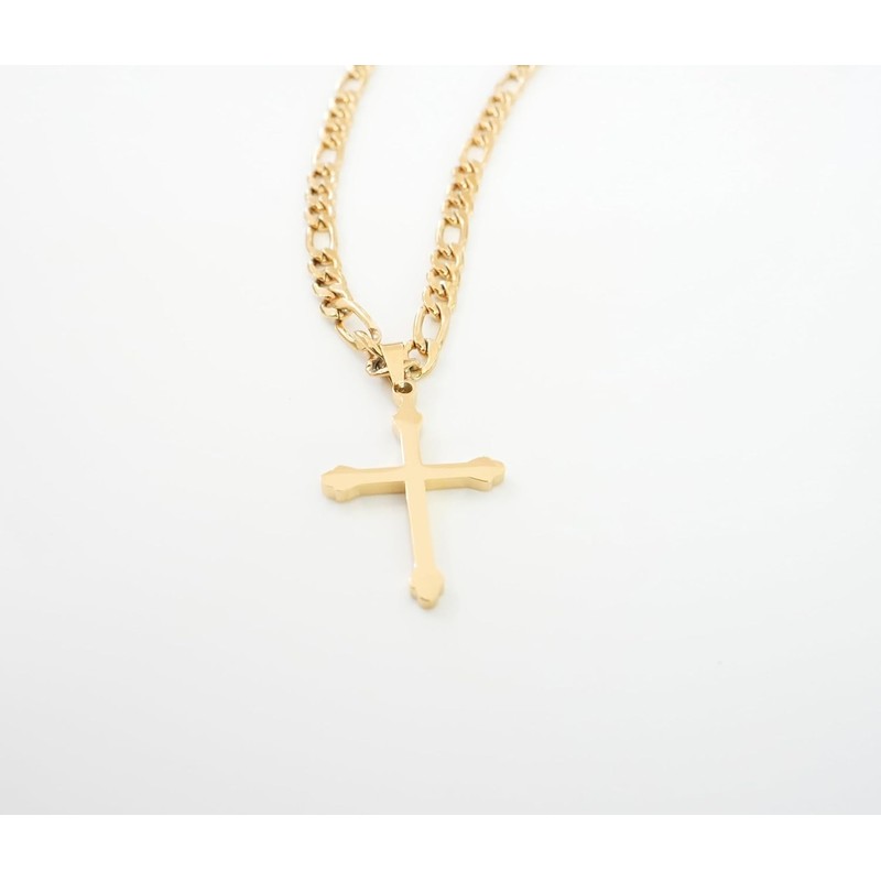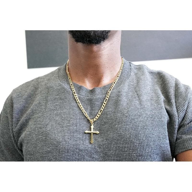 - Sturdy: High-grade Quality Gold cross chain for men, long lasting and sturdy mens necklace for daily wear without worry. The gold cross pendant is 35mm high and 24mm wide. The included Gold FIlled Figaro Chain is 5mm wide.