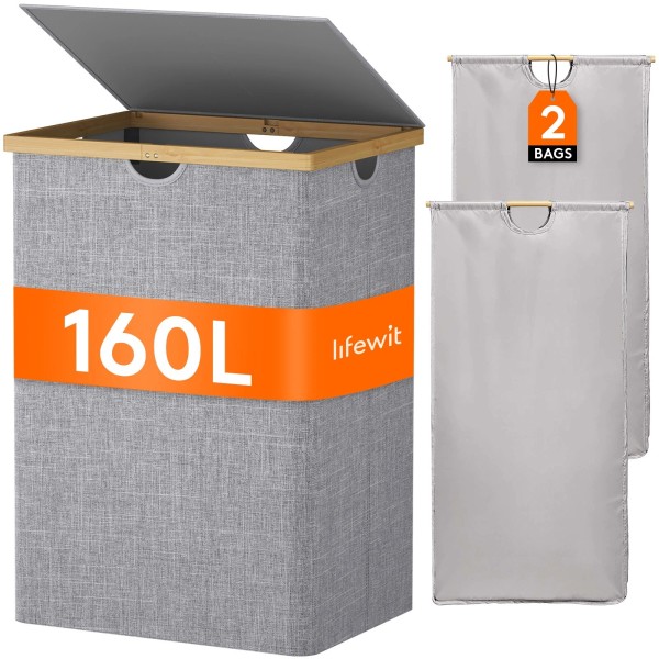 Lifewit 160L Double Laundry Hamper with Lid, Extra Large Bamboo Laundry Basket - Gray