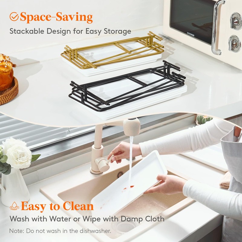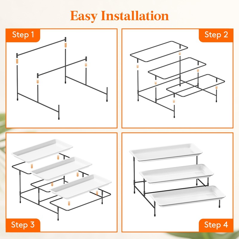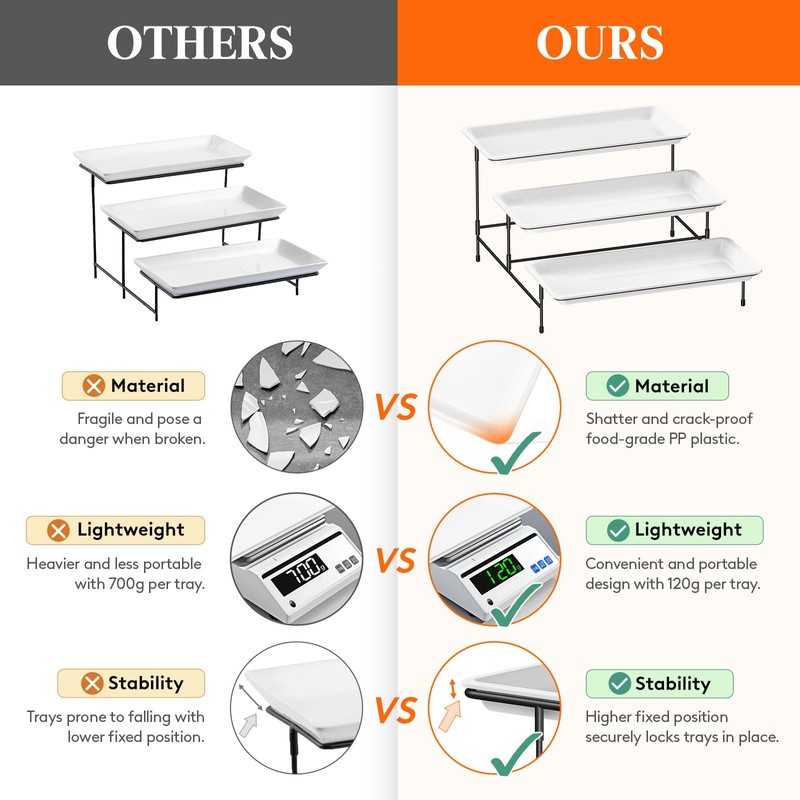 - Save Space: The serving tray features a 3-tier design that maximizes vertical space, adding elevation to your food display. It efficiently utilizes limited table space while presenting the food in an organized and appealing manner. When not in use, the trays can be stacked for easy storage.