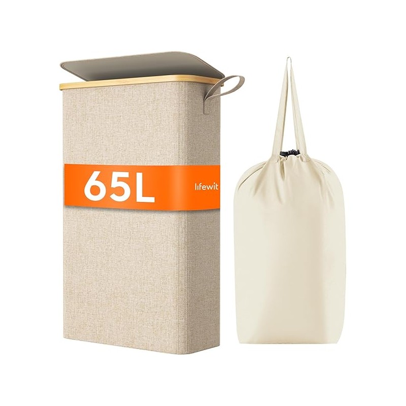 Lifewit 65L Slim Laundry Hamper with Lid, Narrow Laundry Basket with Removable Bag & Bamboo Handles, Fodable Thin Dirty Clothes Hamper for Laundry Collapsible Bin for Bathroom Bedroom Dorm, Beige