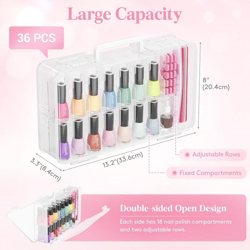 - Portable Nail Polish Organizer: This nail polish organizer case holds 36 bottles, keeping everything neat and easy to access; features a sturdy handle for easy carrying; it's compact yet spacious, making it perfect for nail salons or travel