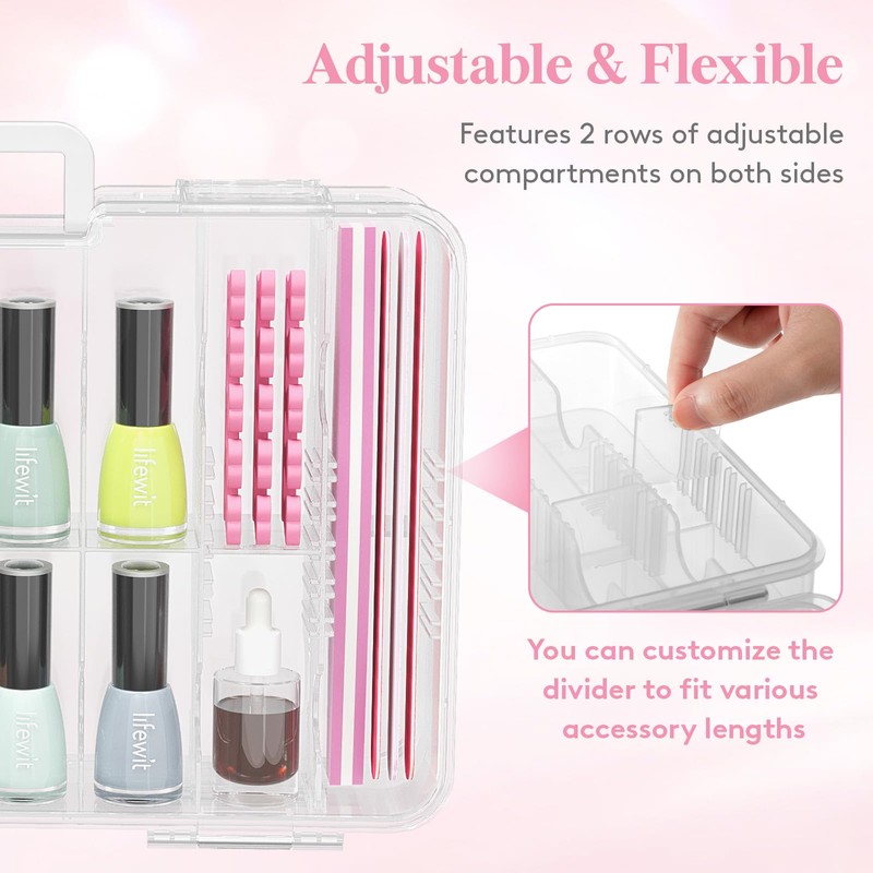 - Flexible and Adjustable: The portable polish storage box features two rows of adjustable compartments on both sides; you can customize the dividers to fit different lengths of nail polish and other accessories, such as sponge buffers, nail separators, and cuticle pushers