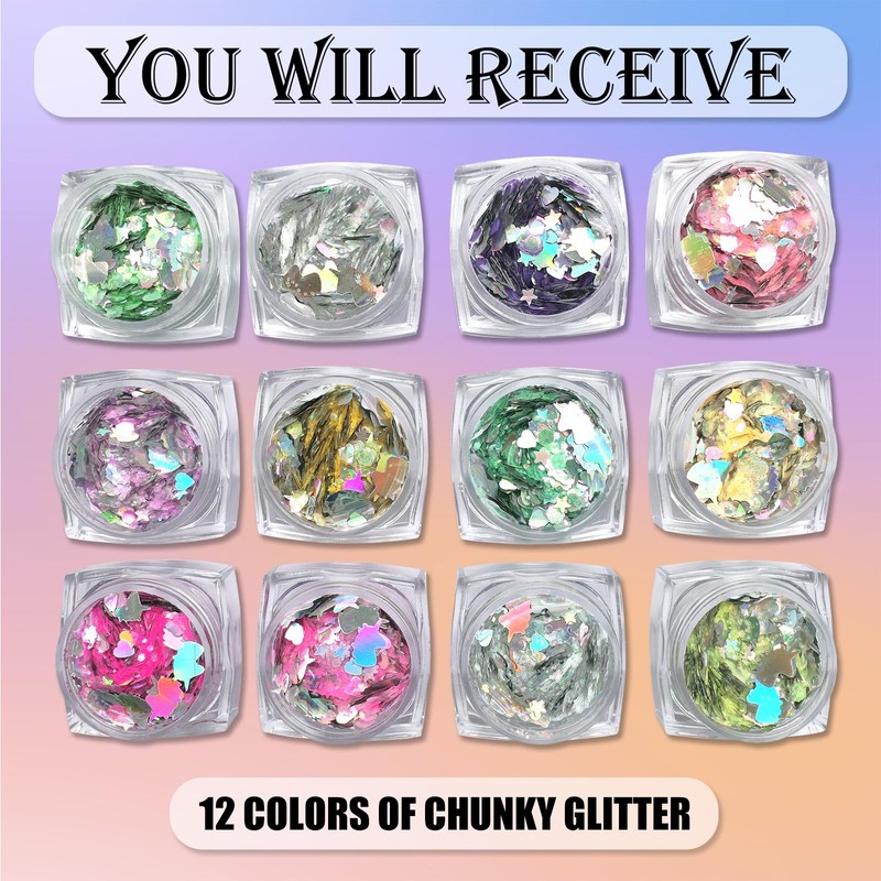 - Chunky Glitter Nail Accessories: Glitter pack can be used alone or match with other nail accessories try more nail art design, make simple nails look shiny and trendy. Glitter set has 12 different colors, pink, purple, green, blue, gold, silver. You can mix and match to create your unique look, whether you're at a party or festival, this product will make you stand out from the crowd. They are suitable for DIY nail art at home to get professional results without the expense of a nail salon.