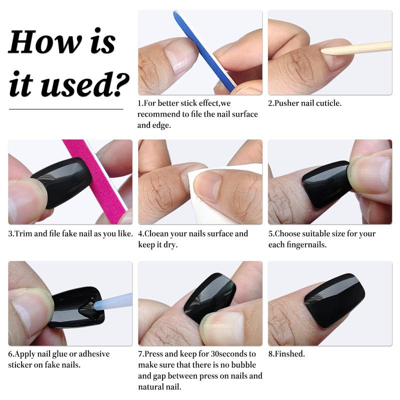 - How to stick preppy medium pink press on nails with adhesive tabs: 1. Using nail stick push nail cuticle. 2. Using nail file to file nail surface and edge for better adhesive. 3. Select the suitable size of the fake nails pink, and file pink acrylic nails to ideal length and shape. 4. Clean and dry the fingernail surface. 5. Select the suitable size of the nail adhesive tabs. 6. Stick nail tabs and push it to be thin and no bubble. 7. Press on medium nails from bottom to tip, and press fake nails backwards for 30 seconds.