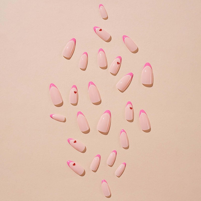 Lifextol French Tip Press on Nails Medium Fake Nails with Love Heart Design Almond Stick on Nails Press ons with Adhesive Tabs, French Pink Nails 24pc