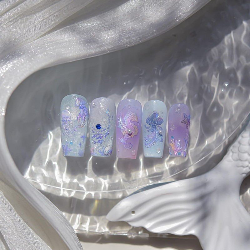 - Self adhesive nail stickers with shell light effect and raised 3D texture for dimensional appearance.