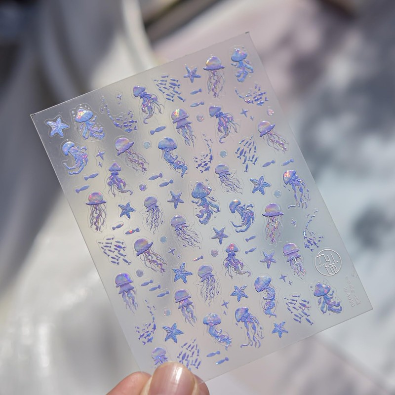 LIFOOST 5D Embossed Nail Decals Starfish Jellyfish Shell Nail Art Stickers Summer Ocean with Blue Shell Light Design