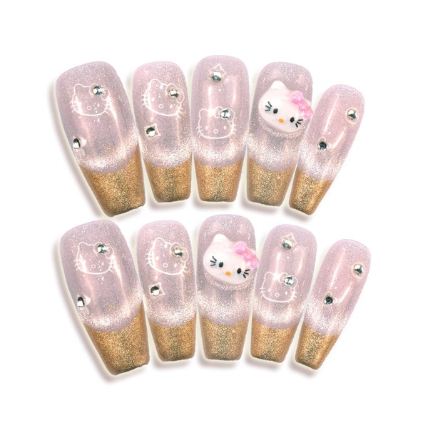 LIFOOST Handmade French Press On Nails Long Coffin Magic Mirror Cat Eye with 3D Cartoon Cat Design 10Pcs, Size Medium