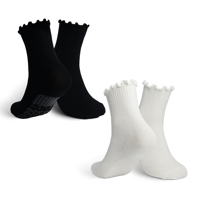 LIFPAU Ruffle Yoga Socks Non Slip Grips Anti Skid Women Athletic Socks Pilates Ballet Barre Crew Socks Frilly Cuff 2 Pairs(Black+White)