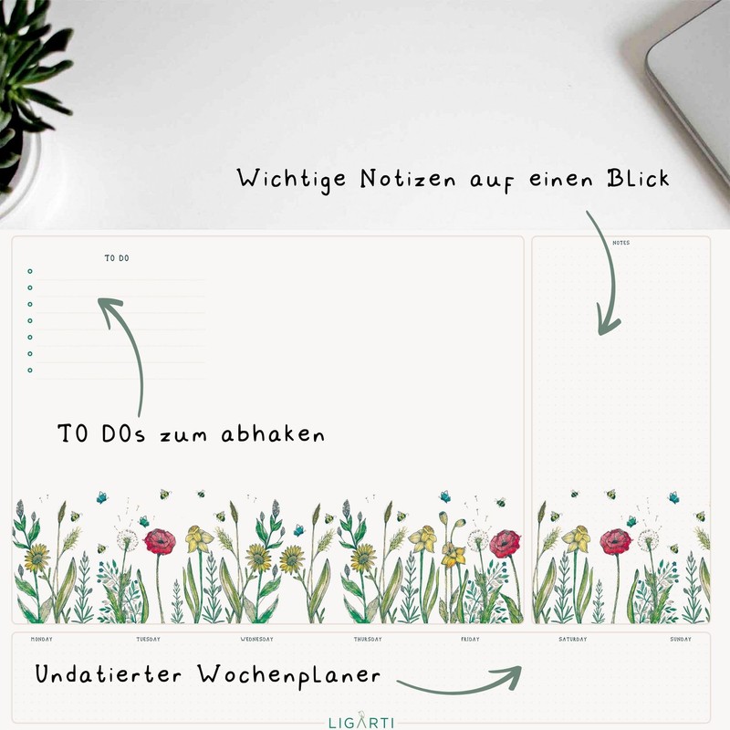 Ligarti Desk Pad Paper (100% Sustainable) A3+ Weekly Planner Pad with To Do List and Changing Motifs - Weekly Planner Undated, Desk Mat (Forest Meadow)