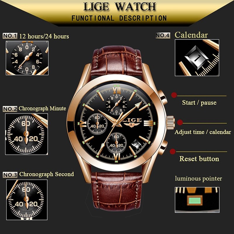 - Men Watch's Strap : LIGE mens watch equipped with soft , comfortable, breathable leather strap ,Watch band is equipped with an adjustable clasp so you can adjust the size to fit your wrist.