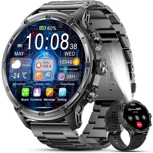 - 【Linterna LED y 2 Correas de Reloj】El smartwatch hombre está equipado con una linterna LED de gran alcance (rango de iluminación de hasta 6-8m), que es adecuado para su uso en entornos oscuros o con poca luz, como el senderismo nocturno, camping, etc, para proporcionar seguridad para su viaje. Elrelojes inteligentes hombre también viene con dos estilos diferentes de correas de reloj, adaptándose a diferentes ocasiones, la longitud se puede ajustar libremente.