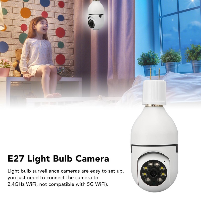 1、Ultra HD Images: Light bulb surveillance cameras provide true ultra high definition images that are sharper than 1080p cameras, giving you a clear view. 2、Access Live: Light bulb surveillance cameras provide access to live streaming via for iPhone, for Android phones, etc. 3、Motion Detection: Light bulb camera supports detecting human motion, sending real time notifications through APP when any motion is detected, and you can view the detected screen through APP at any time. 4、Two Way Talk: Light bulb camera built in microphone and speaker, two way sound function, talk with family in front of the camera. 5、Simple Setup: Light bulb surveillance cameras are easy to set up, you just need to connect the camera to 2.4GHz WiFi, not compatible with 5G WiFi). 6、Easy to Install: Lght bulb surveillance cameras can be installed using a common E27 bulb base, no additional installation steps are required.