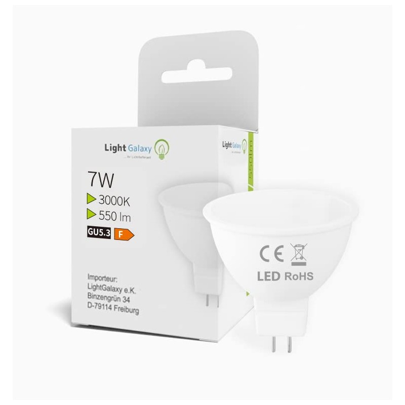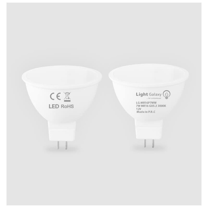 - Our high-quality MR16 GU5.3 LED spotlights are very good quality. LED MR16 energy-saving bulbs ensure an ideal replacement of your 60 watt halogen spotlights with only 7 watts. 3000K warm white, brightness: 550 lumens. Voltage: AC/DC 12 V, beam angle 120° wider, not dimmable