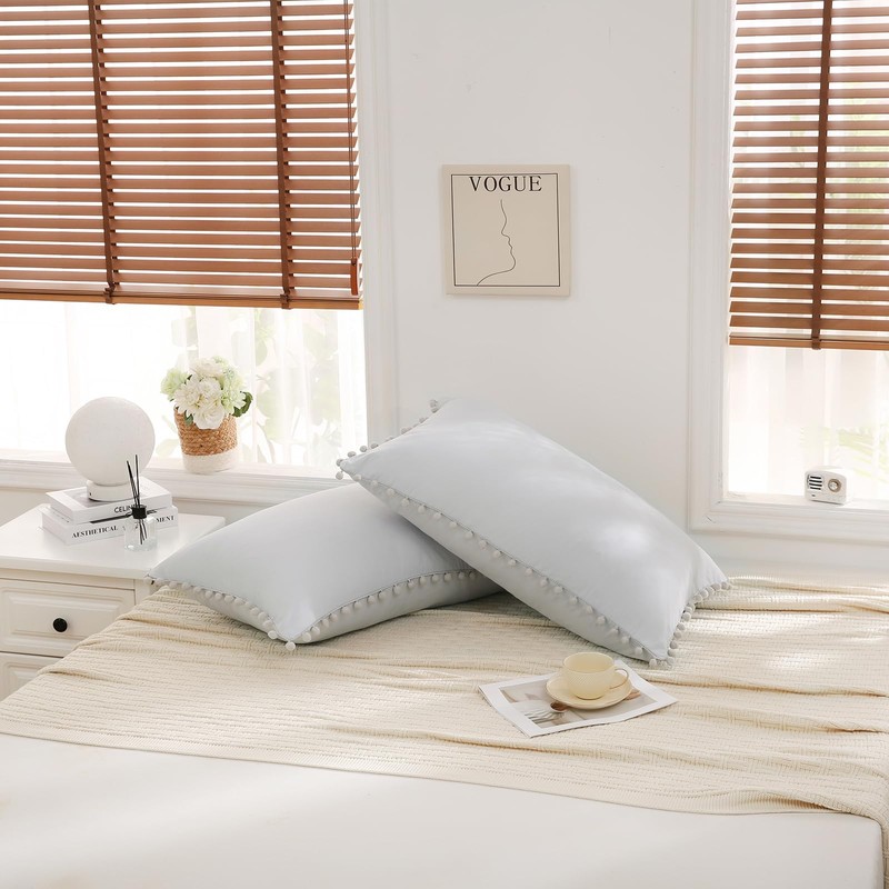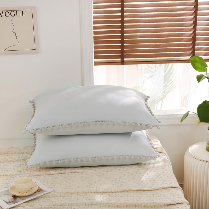 Light Gray Pom Poms Pillowcases, Standard Queen Pillow Cases Set of 2, 100% Washed Microfiber,Pale Gray Ball Fringe Pillow Cover, 2 Pack (Queen, Grayish)
