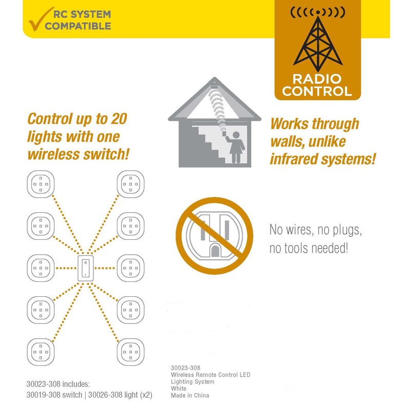 - Remote Control Lights – Operates conveniently by remote switch allowing you to control your lighting wirelessly from up to 60ft away, even through walls