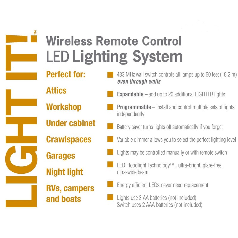 - Install Anywhere – Wireless lighting installs anywhere you need it without plugs, wires or tools