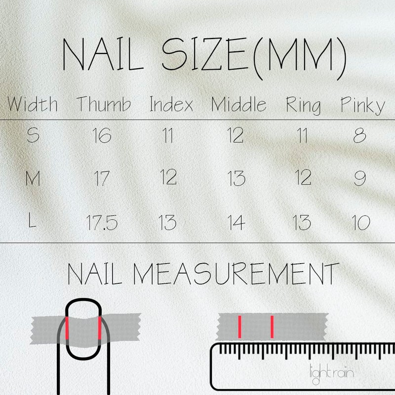 How to apply press on nails? 1.Clean and prep your nails. 2.Push back your cuticles. 3.Peel the backing off one side of tape and press it to your nail. Choose tape which is bigger than nails not smaller, and run your fingers over the top (non-sticky) side of the tape to ensure it’s smooth. If the tape folds in on itself or bubbles up, you may need to remove it and use another piece. 4.Remove the backing from the top side of the tape. 5.Apply the fake nail, starting at your nail bed. 6.Press and smooth the tape over the nail to remove trapped air and ensure it sticks evenly. 7.Use the orangewood stick to gentlely remove the excess adhesives that over than nails. 8.Away from water for at least 3 hours. How to remove press on nails? Soak your nails in water for 5-10 mins and gently pry off the nails with an orangewood stick. Are this nails reusable? Yes, these nails are reusable if you use nail adhesive tabs – as you can just roll the nail adhesive tab off the false nail and wear them again. What comes with nail purchase? Every order will come with a prep kit (a mini nail file, a orangewood stick, a storage box, a sheet of nail adhesive tab, and detailed instructions on how to apply remove your press on nails.