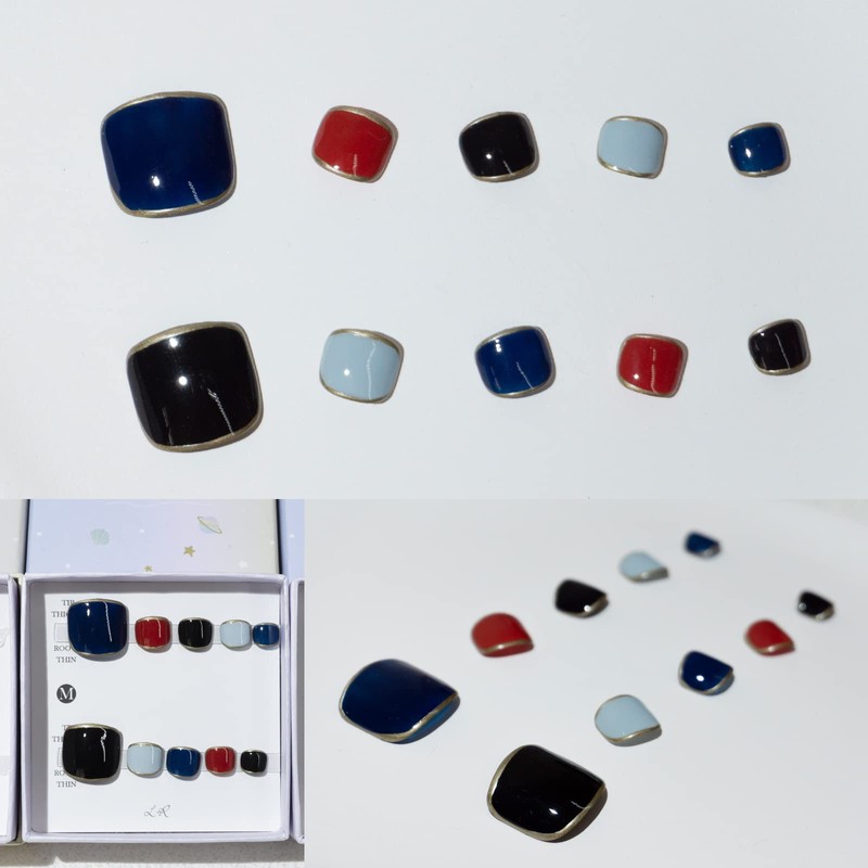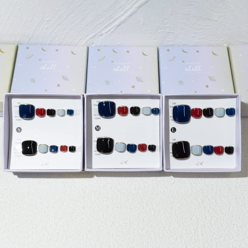 How to apply press on toenails? 1. Clean and prep your toenails. 2. Push back your cuticles. 3. Choose tape which is suitable for your nails, peel the backing off one side of the tape and press it to your toenail, and run your fingers over the top (non-sticky) side of the tape to ensure it’s smooth. If the tape folds in on itself or bubbles up, you may need to remove it and use another piece. 4. Remove the backing from the top side of the tape. 5. Apply the fake toenail, starting at your nail bed. 6. Press and smooth the tape over the nail to remove trapped air and ensure it sticks evenly. 7. Use the orangewood stick to gently remove the excess adhesives that are over the nails. 8.Away from water for at least 3 hours. How to remove press on toenails? Soak your toes in the water for 5-10 mins and gently pry off the nails with an orangewood stick. Are these toenails reusable? Yes, these nails are reusable if you use nail adhesive tabs – as you can just roll the nail adhesive tab off the false nail and wear them again. What comes with a toenail purchase? Every order will come with a prep kit (a mini nail file, an orangewood stick, a storage box, a sheet of nail adhesive tab, and detailed instructions on how to apply and remove your press on toenails.