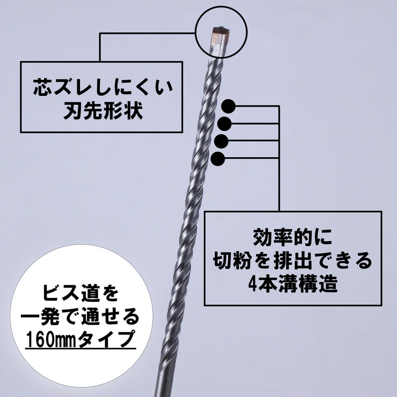 • Note: Please use with a lightweight hammer drill with SDS chuck. Please do not use if any abnormalities such as cracks are found on the entire bit or chip before use. Please be sure to remove the power plug (battery etc.) before installing or removing the bit. Insert the bit until it is completely locked and make sure it is locked before using. Be sure to wear protective glasses and dust mask when working. Do not touch the bit while rotating with your hand or body. The bit immediately after use is very hot, so please do not touch it with bare hands. Do not use excessive force on material that is prone to crack