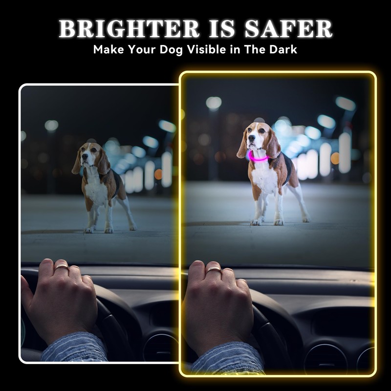 - [KEEP YOUR PET SAFE] Are you always worried that your dog will be hit by a car when running outdoors at night or in low light conditions? This light up dog collar is extremely visible at night, keeping your dog to be clearly seen 200 meter and also alerting distracted pedestrians and drivers to notice our lovely furry friends. You can rest assured that your pet is fully protected in dark with our glow collar.