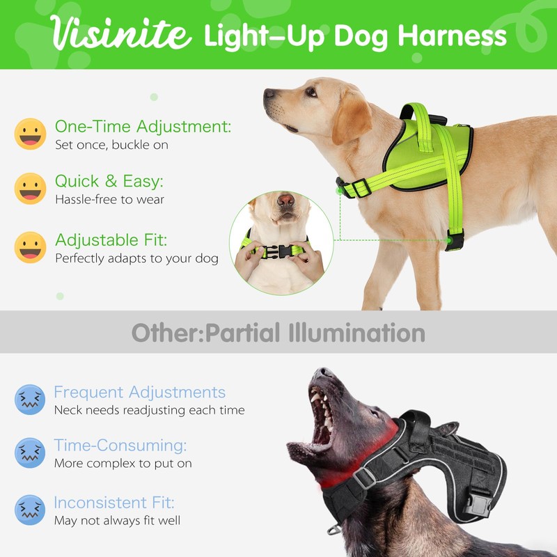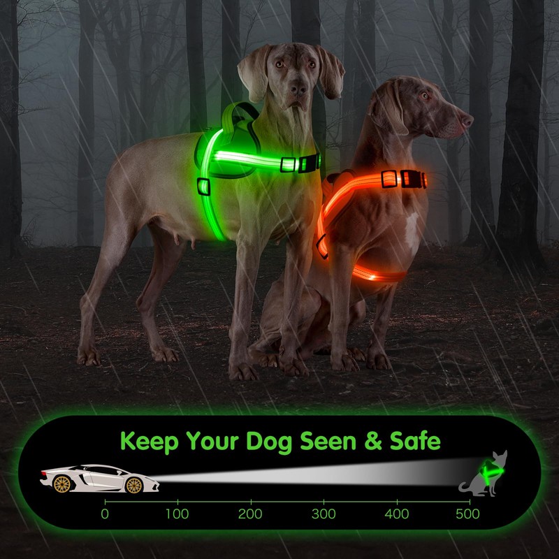 - UNMATCHED 360 DEGREE VISIBILITY With an ultra bright 0.6 inch LED light strip, our glowing dog harness ensures that your dog is visible from up to 150 meters away. Increase your dog's safety against potential hazards such as cars, bicycles or runners. This luminous dog harness will keep your dog safe during night walks, early morning trips and in low light conditions so that they will never be lost sight.
