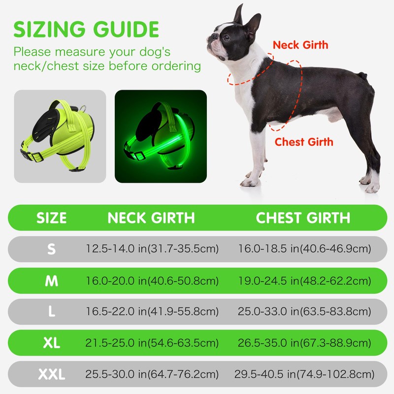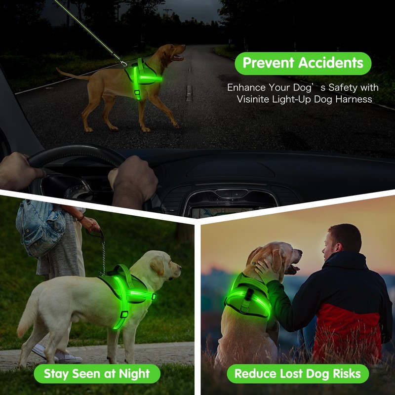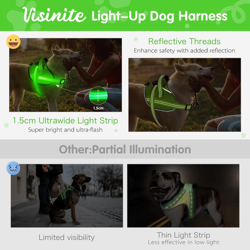 - UNMATCHED 360 DEGREE VISIBILITY With an ultra bright 0.6 inch LED light strip, our glowing dog harness ensures that your dog is visible from up to 150 meters away. Increase your dog's safety against potential hazards such as cars, bicycles or runners. This luminous dog harness will keep your dog safe during night walks, early morning trips and in low light conditions so that they will never be lost sight.