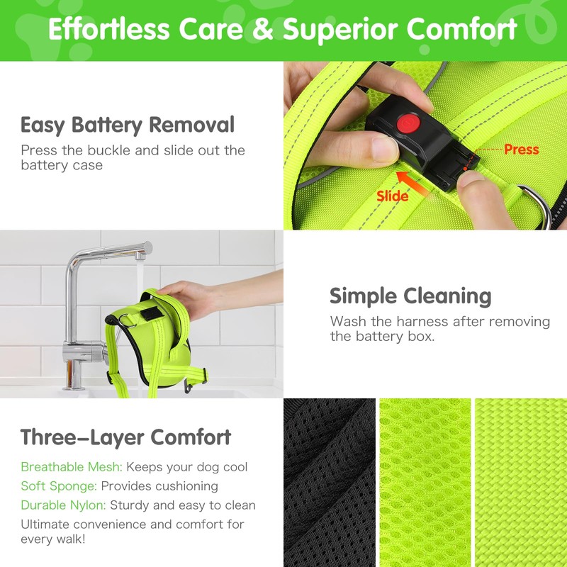- PREMIUM COMFORT WITH BREATHABLE DESIGN Made of waterproof luminous thread and a soft cotton lining, combined with a breathable mesh outer layer, our luminous dog harness guarantees maximum comfort and durability. Ideal for any activity, whether a relaxed walk or an adventurous hike, rain or shine, our luminous dog harness ensures that your pet stays comfortable and visible.