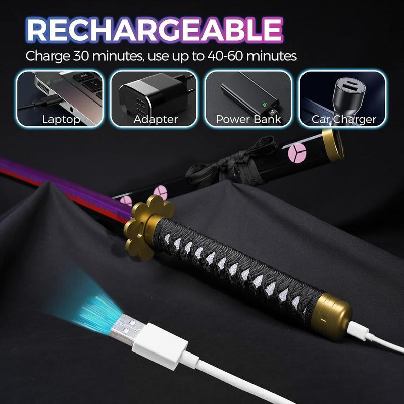 Our Swords can light up, the blades on these sabers light up at the push of a button or tapping the back of the hilt with the palm of the hand. Rechargeable, the light up swords only take half an hour to fully charge, after charging can continue to emit light 3-4 hours, fully meet your daily cosplay or play needs.