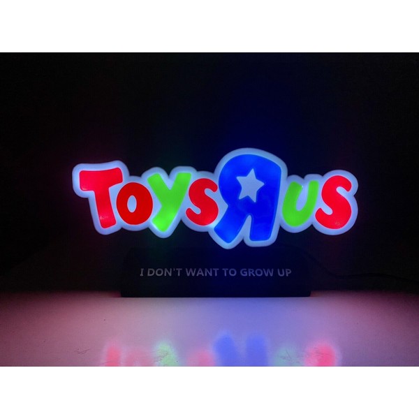 If you are looking for a unique Toys R Us sign look no further! This light up sign uses a usb plug in and LED lights to glow. This is roughly 9” wide and sits up on its own stand