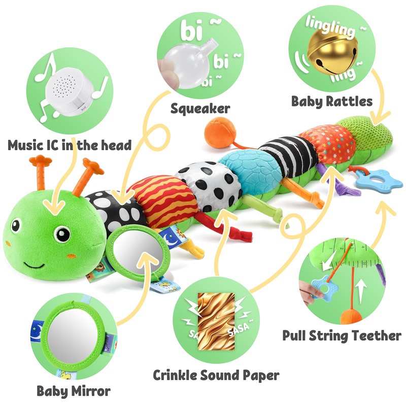 - Learning Adventure Sensory Toys: Embark on a sensory-rich journey with our caterpillar 's crinkle,rattles,Mirror,Pull String and bibi squeak features. Carefully designed with different textures and sounds, it offers a multi-sensory experience that aids in fine motor skill development and auditory stimulation.Unleash the potential of baby girl toys for early learning.
