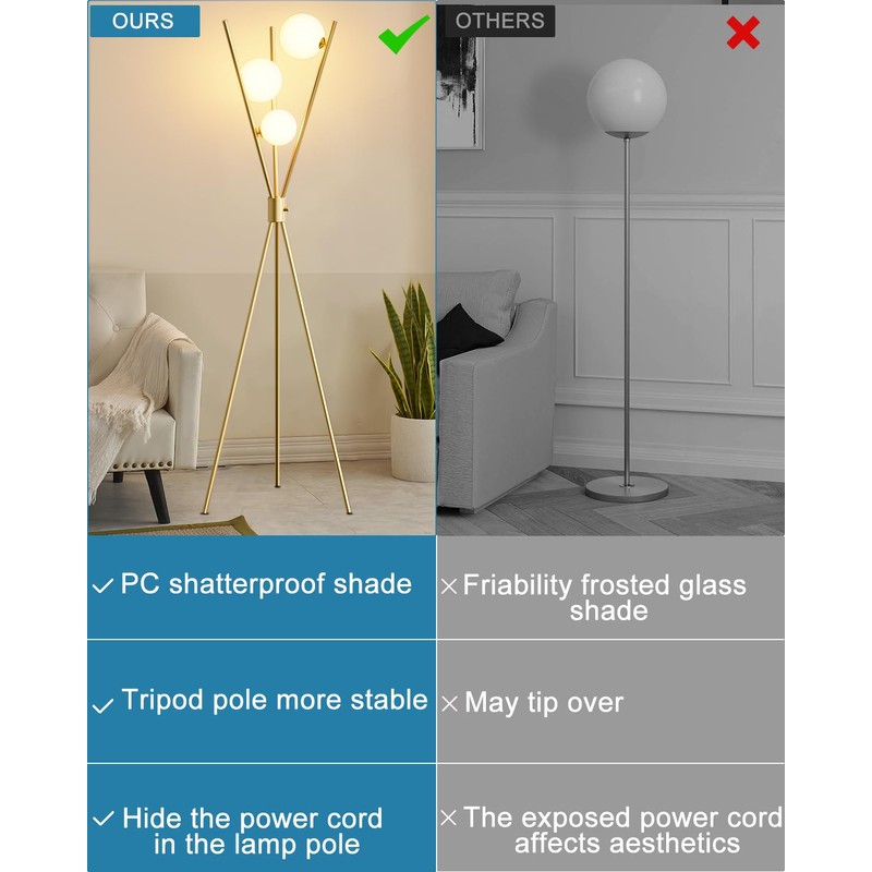 - ltra-Stable Tripod Structure Base Design ✨Our globe floor lamp is 65IN tall and made of high-quality metal. The pole is straight and never bent and the weighted base is stable to prevent tipping, which is very safe for children, the elderly and pets.
