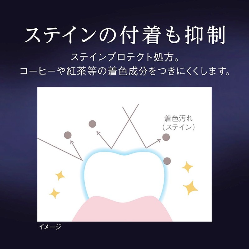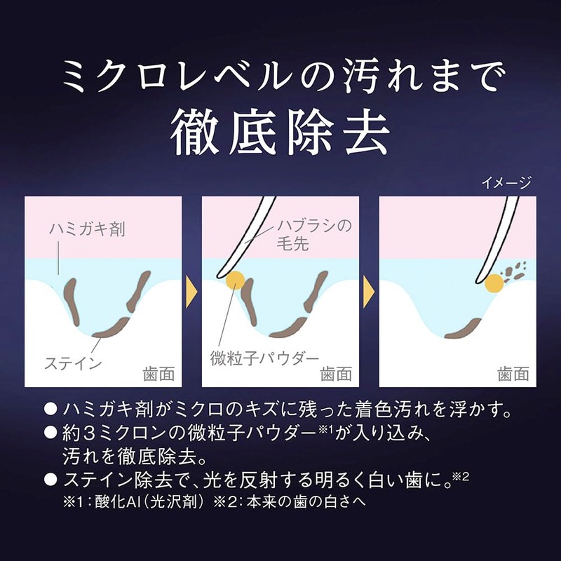 - Thoroughly removes staining from micro scratches In addition, it suppresses the adhesion of stains and reflects light with its bright white teeth. (*For the whiteness of the teeth )