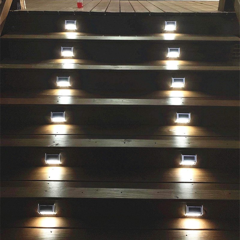 **Description:** This modern LED solar stair light is fantastic for lighting, decorating and marking. It can be easily mounted either vertically or flatly on staircases, paths, gardens, decks, docks and fences. The battery enables the light to run up to 9 hours through the night and recharge automatically during the day. **Specifications** Solar Panel: Monocrystalline silicon solar panel LED Type: Floodlight Light Color: White Lumen: 10~12 Battery: 1.2V/600mAH AAA Ni-MH Material: Stainless Steel +ABS+ PC Product Dimension: 3.9*0.9*3.3 inches Unit Net Weight: 1.2 Lbs **Package Includes** 6 x Solar Powered LED Light 6 x Screw Set 1 x English User Manual **Note:** 1\. Please put the light under the standard sunlight 6 to 8 hours before using it. 2\. Working power of the solar panel will be influenced by weather, location etc. 3\. Get charged only when switched to "ON". 4\. Waterproof in rainy and wet conditions, but don't dip it intentionally in water.