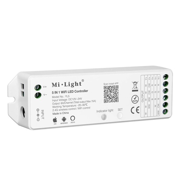 - Super compatibility: 5-in-1 smart LED controller, compatible with monochrome, CCT, RGB, RGBW and RGBCCT LED strips. DC12V-24V, output: 6A/channel, total output max: 15A