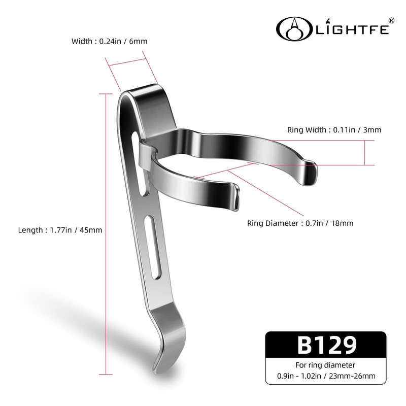 LIGHTFE B129 Flashlight Clip is Suitable for flashlights with a Diameter of 20-23 mm and a Slot Width of 3-3.4 mm. Stainless Steel Pen Clip, can be Used as a hat Clip, Pocket Clip, or Bag Clip