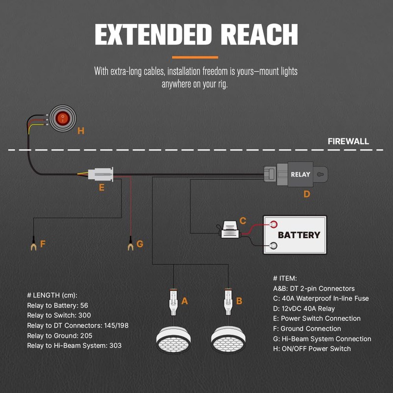 - Rugged Safety: Engineered for tough conditions, this Lightfox wiring harness features high-efficiency 14 AWG cables that ensure consistent power on rough terrain. A 12V 40A relay supports high current loads for steady, bright lighting, while a waterproof 40A fuse protects against surges and short circuits—keeping you safe wherever the adventure leads.